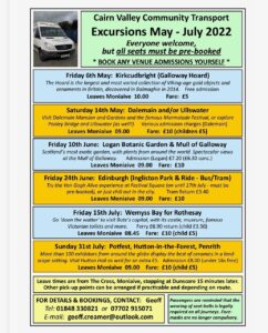 Cairn Valley Community Transport are always seeking to expand their pool of volunteer drivers. If you want to get involved, please contact Stephen Sparrow on 01848 335298 or email hello@cvct.org.uk